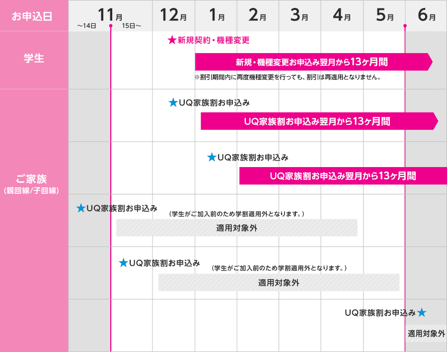 - 受付期間内に初めて「UQ家族割」の適用をお申し込みいただいた回線のうち、その適用を開始した月において、スマホプランMまたはスマホプランLの適用を受け、かつ学生回線を含むUQ家族割グループに所属していた回線(学生回線に該当するものを除きます。以下「家族回線」)が対象となります。
