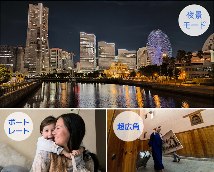 メインカメラには約5,000万画素のソニー製1/1.28インチ大型センサーIMX707を採用。ピクセルビニングにより4つの画素を1つにまとめることで、暗所でも美しい撮影が可能です。また、ポートレートやダイナミックな風景、集合写真の撮影に最適な光学2倍望遠レンズ、超広角レンズも搭載しています。