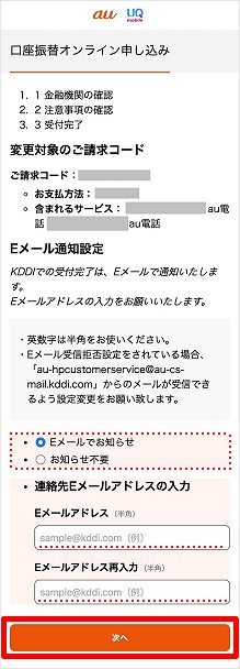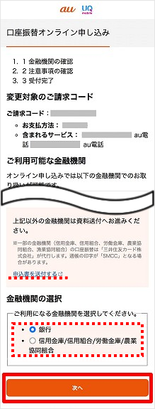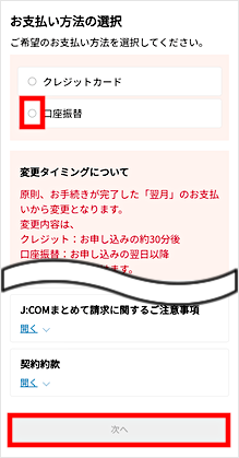 [口座振替]を選択し、変更タイミング/ご注意事項をご確認の上、[次へ]をタップします。