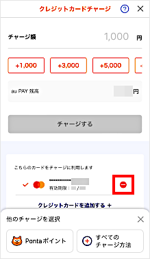 登録されているクレジットカード情報を削除する場合、au PAYのチャージ画面で登録を削除したいクレジットカード番号の右にある「⊝」アイコンをタップし、表示される「削除する」をタップすることで削除できます。