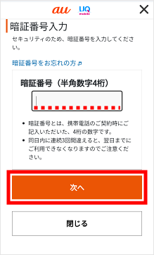 ご契約時に決めた4桁の暗証番号を入力し、[次へ]をタップします。