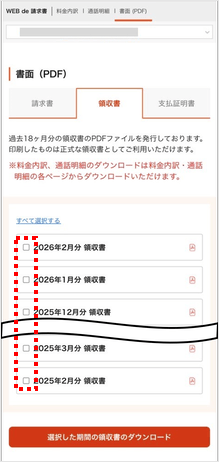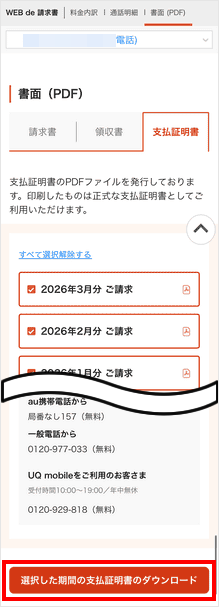 支払方法が口座振替の場合にのみ、過去18カ月分の領収書をMy UQ mobile(Web)の「WEB de 請求書」からPDF形式でダウンロードできます。