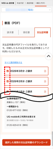 過去18カ月分の支払証明書を、My UQ mobile(Web)の「WEB de 請求書」からPDF形式でダウンロードできます。