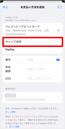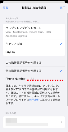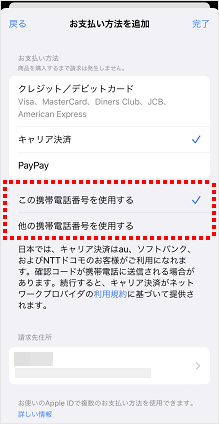 画像は、支払い方法「キャリア決済」の画面です。