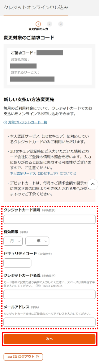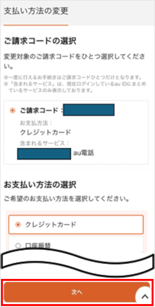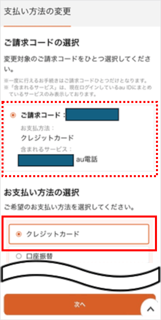 変更タイミング、ご注意事項をご確認の上、お手続きをするご請求コードを選択し、[クレジットカード]をタップします。