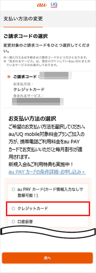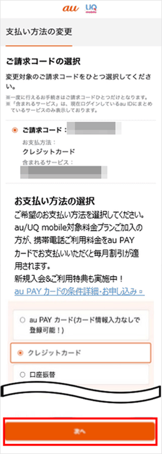お手続き完了の翌月請求から、ご登録のau PAY ゴールドカード・au PAY カードに請求いたします。お手続きが完了するまでは、現在の支払方法が継続します。