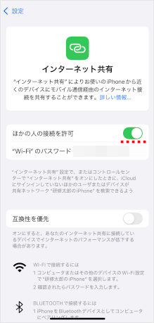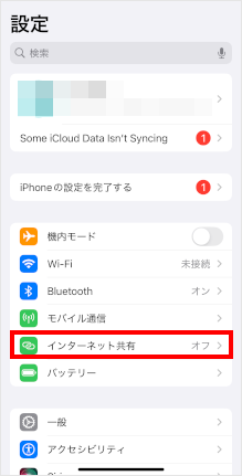 テザリングを行いたいiPhoneまたはiPadで、インターネットを共有するための設定を行います。