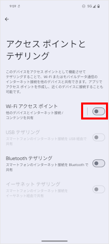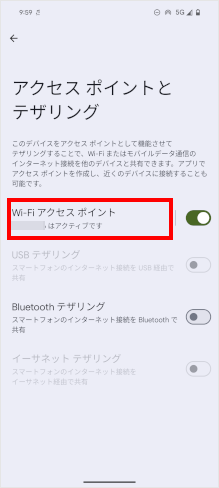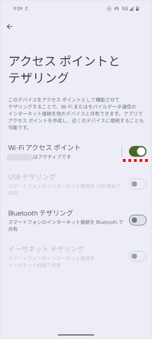 本手順では[Wi-Fiアクセスポイント]のスイッチをタップしてオンにします。