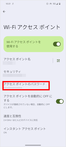 [アクセスポイントのパスワード]をタップすると、現在のパスワードの確認/変更ができます。