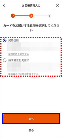 カードをお届けする住所を選択して[次へ]をタップします。