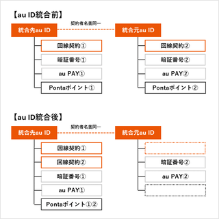 「au ID統合前」と「au ID統合後」の構造は以下の図をご確認ください。