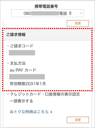 My UQ mobile(Web)に現在の支払方法を表示するには、WEB de 請求書の参照権限を「あり」にすることと、クレジットカード・口座番号の表示設定を「一部表示する」にすることが必要です。