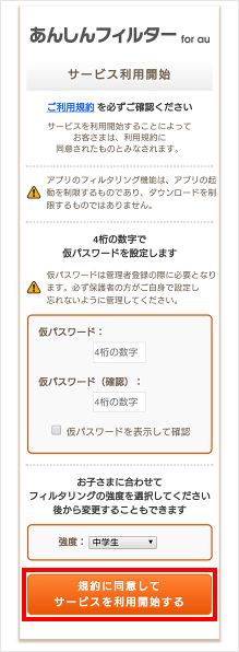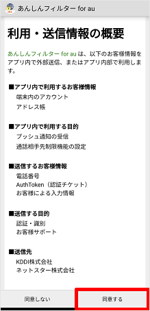 お子さまの端末で「あんしんフィルター for au アプリ」をインストールし、サービスの利用登録を行います。