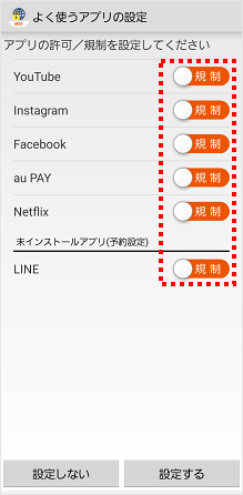 よくつかうアプリの[許可]または[規制]のスイッチをタップします。