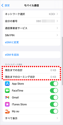現在の累計のモバイルデータ通信量・ローミングデータ通信量・アプリごとのデータ通信量の目安を確認することができます。