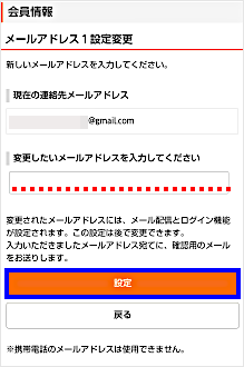 今後ご利用されたいメールアドレスを入力し、[設定]をタップします。