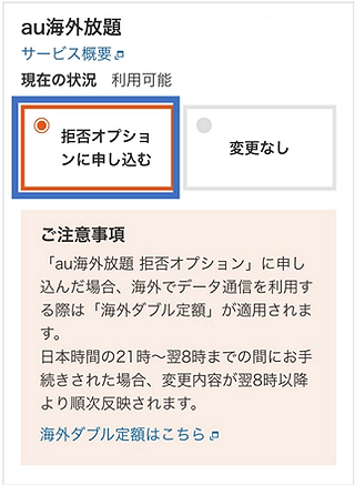 「海外ダブル定額」のご利用をご希望の場合は、「au海外放題拒否オプション」をお申し込みください。