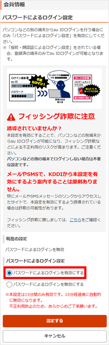 ※第三者による不正利用を防ぐため、パソコンでログインした後は本設定を無効(オフ)にする事を推奨します。
