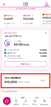 My UQ mobile(アプリ)でのご確認方法は、以下の手順をご確認ください。