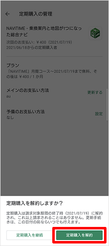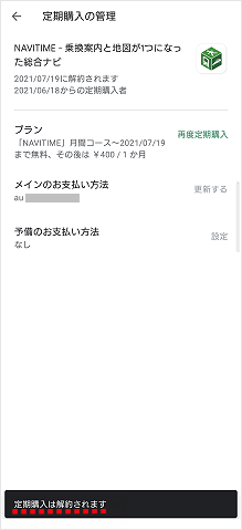 ※即時解約でない場合は、「○○○○/○○/○○に解約されます」と表示されます。