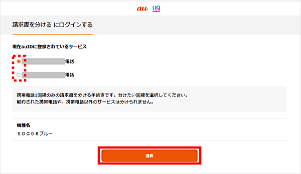 電話番号の選択画面が表示された場合、現在の請求から分けたい回線を選択して[選択]をタップします。