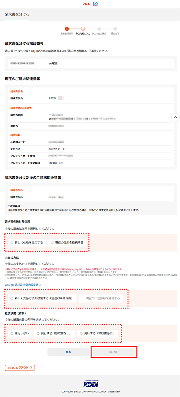 請求書の送付先住所/お支払方法/紙請求書(有料)の発行有無をそれぞれ選択し、[次に進む]をタップします。