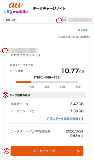 ③データ残量の内訳:今月ご利用可能なデータ量と、チャージされたデータの残量を確認できます。