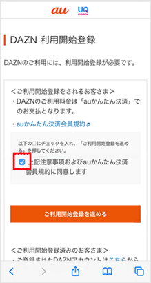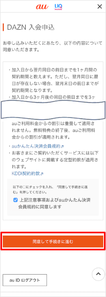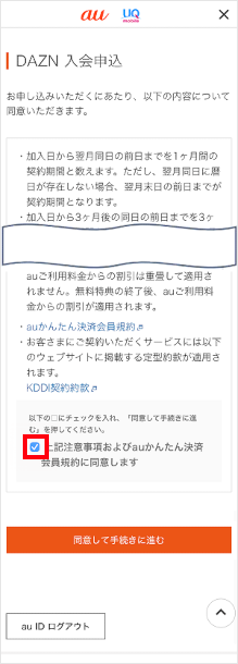 「上記注意事項およびauかんたん決済会員規約に同意します」にチェックを入れます。