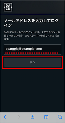 既に登録済のDAZNアカウント(メールアドレス)を入力し、[次へ]をタップします。