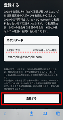 支払い方法が「KDDI/沖縄セルラー電話」と表示されていることを確認し、[登録する]をタップします。