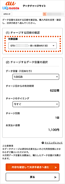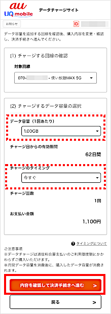 ご希望の「データ容量」を選択し、「チャージのタイミング」が「今すぐ」になっていることを確認後、[内容を確認して決済手続きへ進む]をタップします。