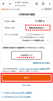 支払い方法を選択し、暗証番号を入力して[支払う]をタップします。
