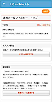 「迷惑メールフィルター トップ」画面で、ご希望のフィルター設定の項目を選択してください。