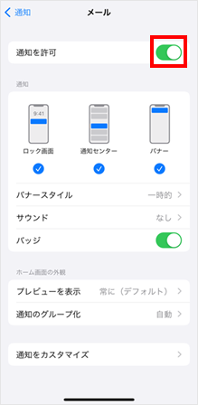 [通知を許可]のスイッチをタップしてオフにします。 ※「通知を許可」をオンにした状態で、ロック画面・通知センター・バナーに表示させるかをそれぞれ選択したり、「通知をカスタマイズ」でメールアカウントごとに通知の設定をすることもできます。