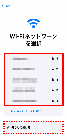 ※セキュリティ設定のあるWi-Fiがご用意できない場合は、「Wi-Fiなしで続ける」を選択してください。