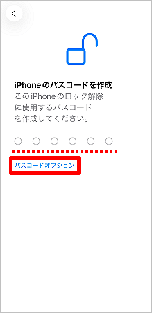 ※数字4桁のパスコードを設定する場合や、パスコードを設定しない場合などは[パスコードオプション]をタップします。カスタムの英数字コード/カスタムの数字コード/4桁の数字コード/パスコードを使用しないのいずれかを選択し、画面の指示に従って設定します。