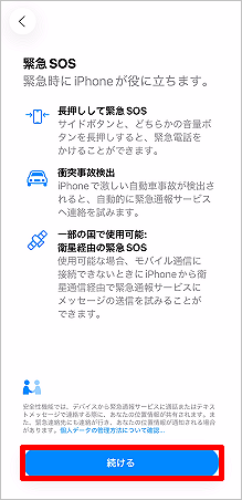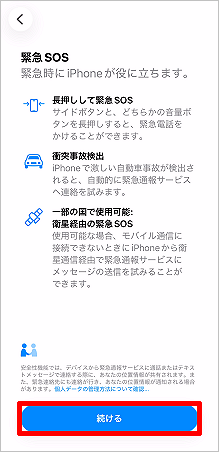 緊急SOSの説明画面を確認し、[続ける]をタップします。