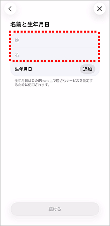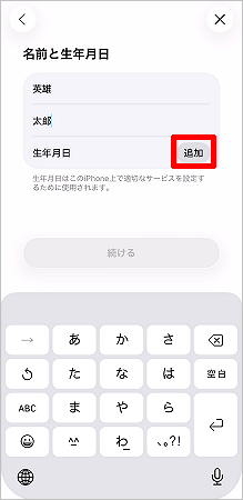 姓・名の入力が完了したら、生年月日の[追加]をタップします。