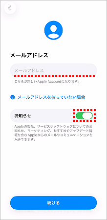 「お知らせ」はAppleの様々な情報(ソフトウエアアップデート/Appleニュースなど)をメールで受け取るか否かタップして選択します。