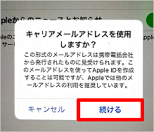 KDDIでは、auメールアドレスの登録を推奨しているため、[続ける]をタップします。