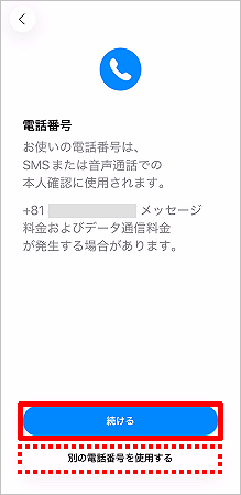 「別の電話番号を使用する」をタップした場合は、確認コードを受信する電話番号を入力し、確認コードを受け取る方法を「SMS」もしくは「音声通話」より選択します。