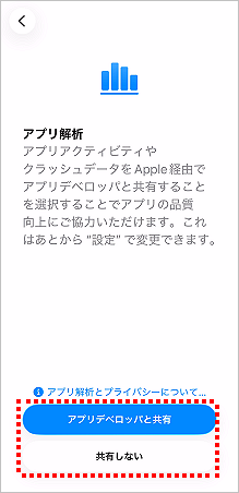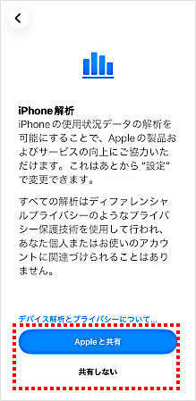 iPhone/iPad解析画面が表示されます。[Appleと共有]もしくは[共有しない]のいずれかの項目をタップします。