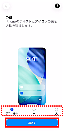 外観(テキストとアイコンのサイズ)を選択し、[続ける]をタップします。