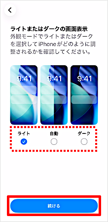 外観モードを「ライト」または「ダーク」を選択し、[続ける]をタップします。