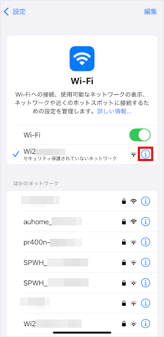 ネットワーク設定を削除したいネットワーク名(SSID)に表示されている[インフォメーションアイコン]をタップします。
