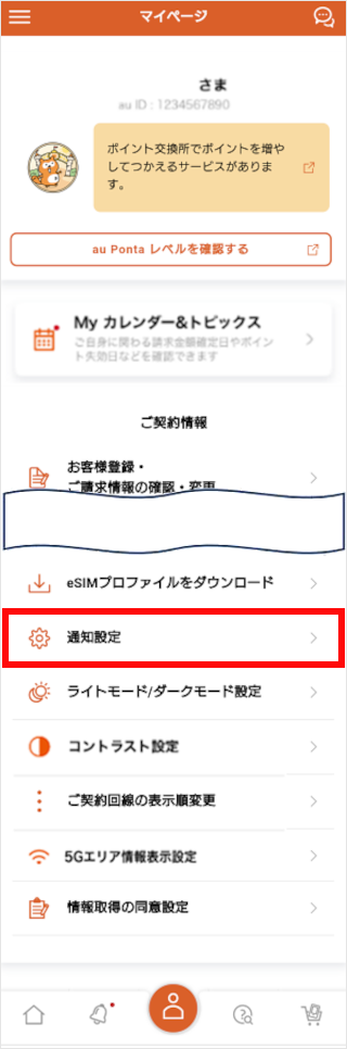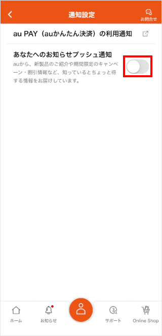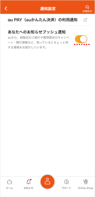 My au(アプリ)のマイページで、通知のオン・オフを切り替えることができます。