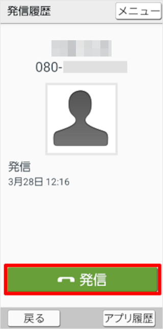 かけたい履歴に表示された[発信]をタップします。