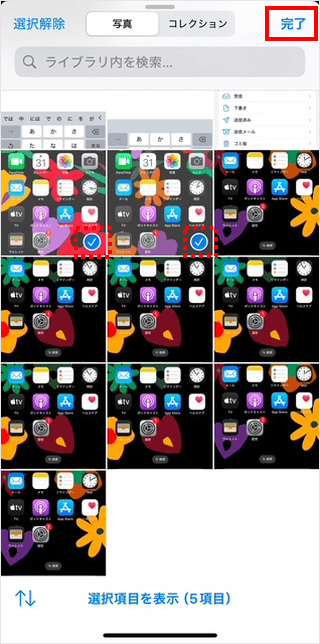 選択した画像に青丸のチェックマークが表示されたことを確認し、[完了]をタップします。