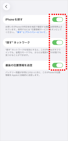 [iPhoneを探す][“探す”ネットワーク][最後の位置情報を送信]のスイッチがオンになっていることを確認されたら、操作は完了です。