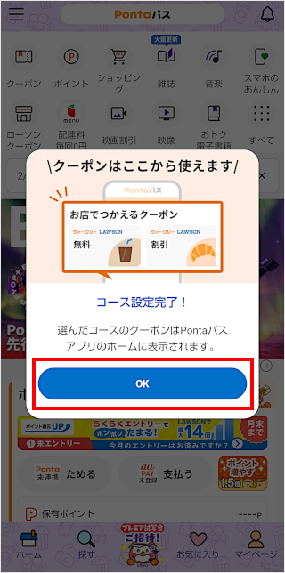「Pontaパスアプリ」で毎月お好きなコースを1つ選ぶことで、クーポンの受け取り/利用ができます。